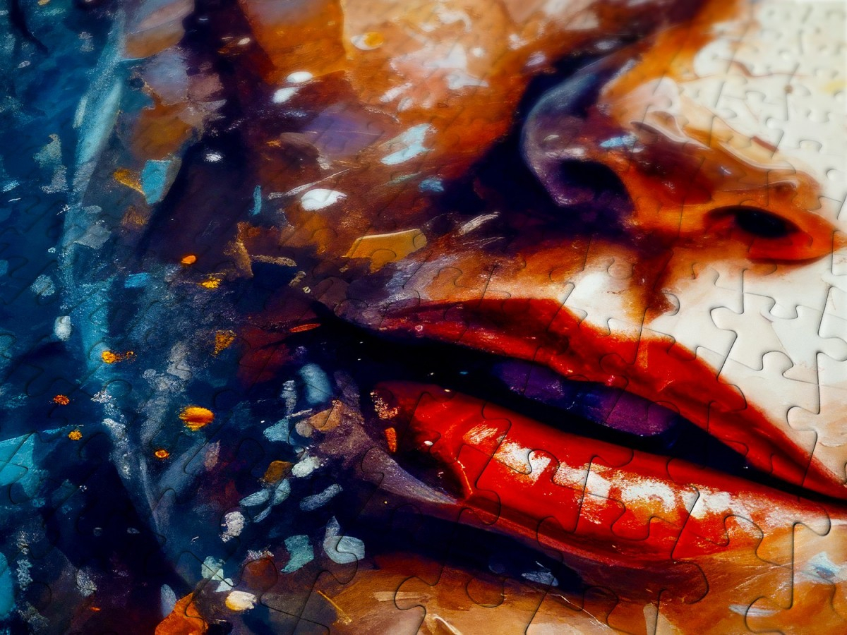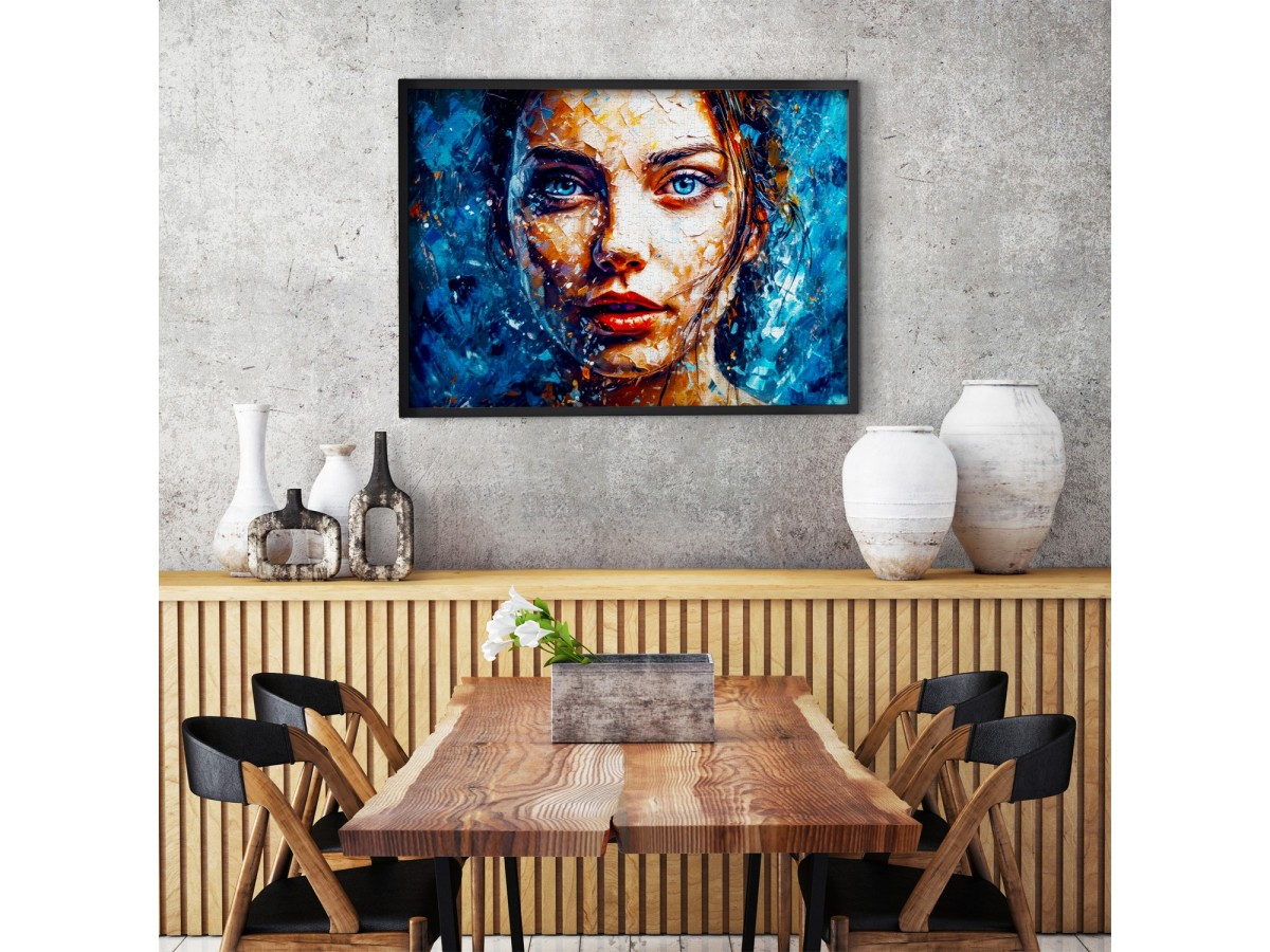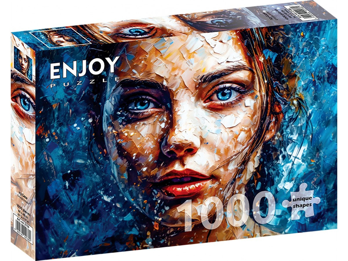 Puzzle-ul Enjoy – Icy Gaze prezinta un portret expresionist spectaculos al unei femei care priveste direct spre privitor, cu o intensitate care capteaza imediat atentia. Ochii mari si albastri sunt centrul compozitiei, emanand emotie profunda si mister. Ilustratia digitala se remarca prin texturi bogate, lovituri de pensula groase si fragmente de culoare care se intrepatrund intr-un mod dinamic. Dominanta de albastru, completata de accente de alb si negru, creeaza un efect vizual puternic si memorabil.