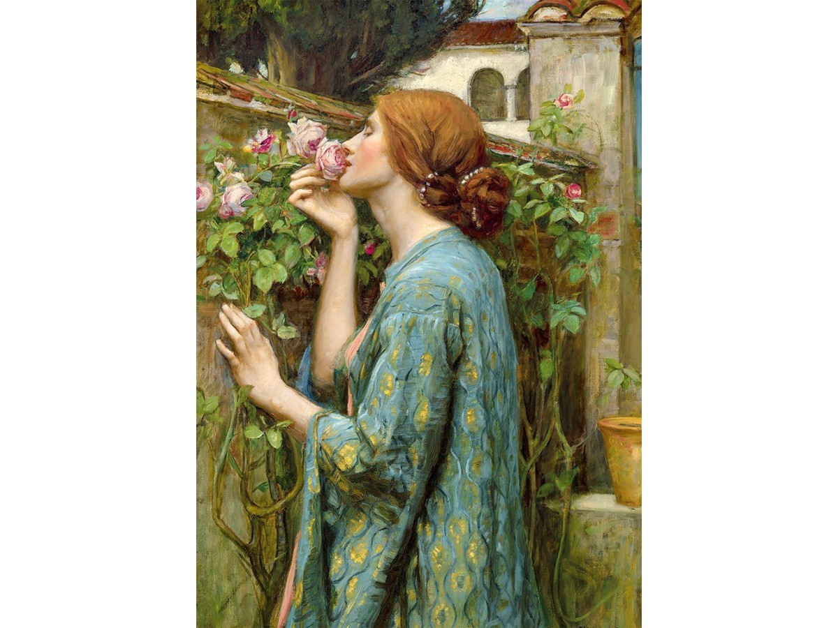 Puzzle-ul John William Waterhouse: The Soul of the Rose de la Enjoy, cu 1000 de piese, redă una dintre cele mai rafinate și emoționante opere ale pictorului englez John William Waterhouse, maestru al epocii prerafaelite. Imaginea surprinde o tânără femeie roșcată, îmbrăcată într-o rochie lungă, albastră, cu motive aurii, care se apleacă ușor pentru a mirosi un trandafir alb într-o grădină luxuriantă.