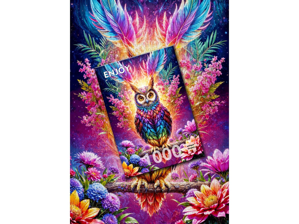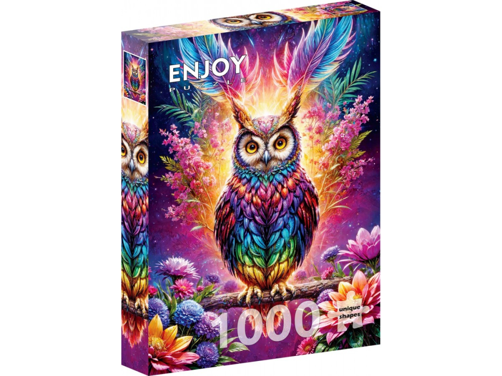 Descopera magia culorilor si misterul noptii cu Puzzle 1000 piese Enjoy – Neon Owl, o ilustratie digitala spectaculoasa ce reda frumusetea unei bufnițe luminate de un fundal cosmic plin de stralucire. Bufnita, cu ochii mari si expresivi, este inconjurata de flori multicolore si detalii vibrante, fiecare pana fiind pictata in tonuri de albastru, mov, roz si portocaliu, intr-un efect aproape neon.