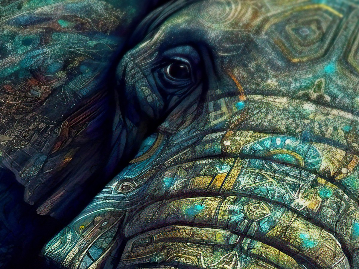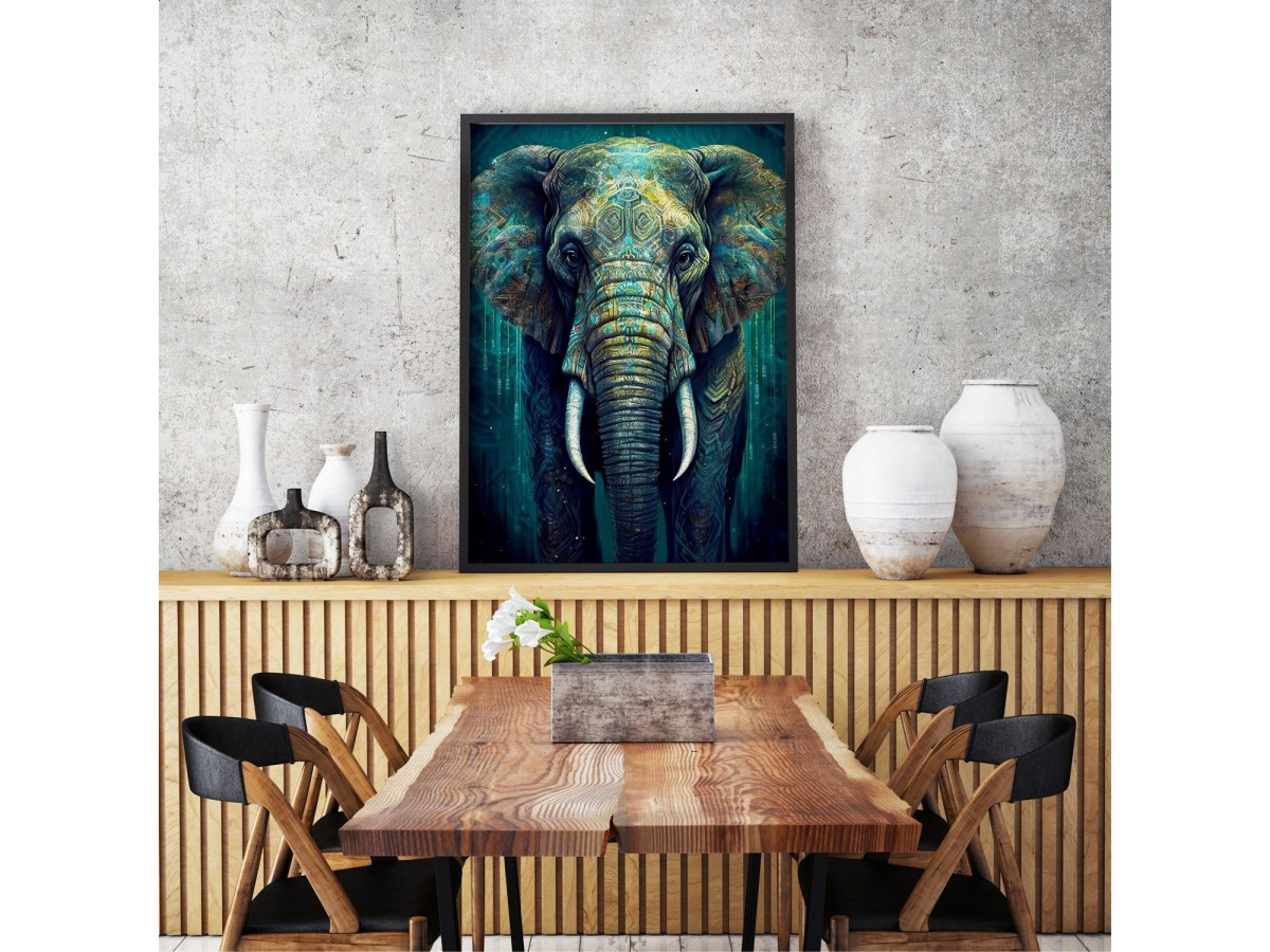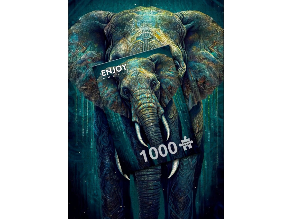 Descopera frumusetea si simbolismul Orientului cu puzzle-ul ENJOY – Oriental Grandeur, o ilustratie digitala impresionanta care aduce in prim-plan imaginea unui elefant impunator. Realizat cu o atentie extraordinara la detalii, acest portret imbina nuante profunde de albastru si verde cu texturi ce amintesc de sculpturi tribale, oferind o aura mitologica si majestuoasa animalului. Privirea directa si expresiva a elefantului creeaza o conexiune intensa cu privitorul, amplificand forta vizuala a imaginii.