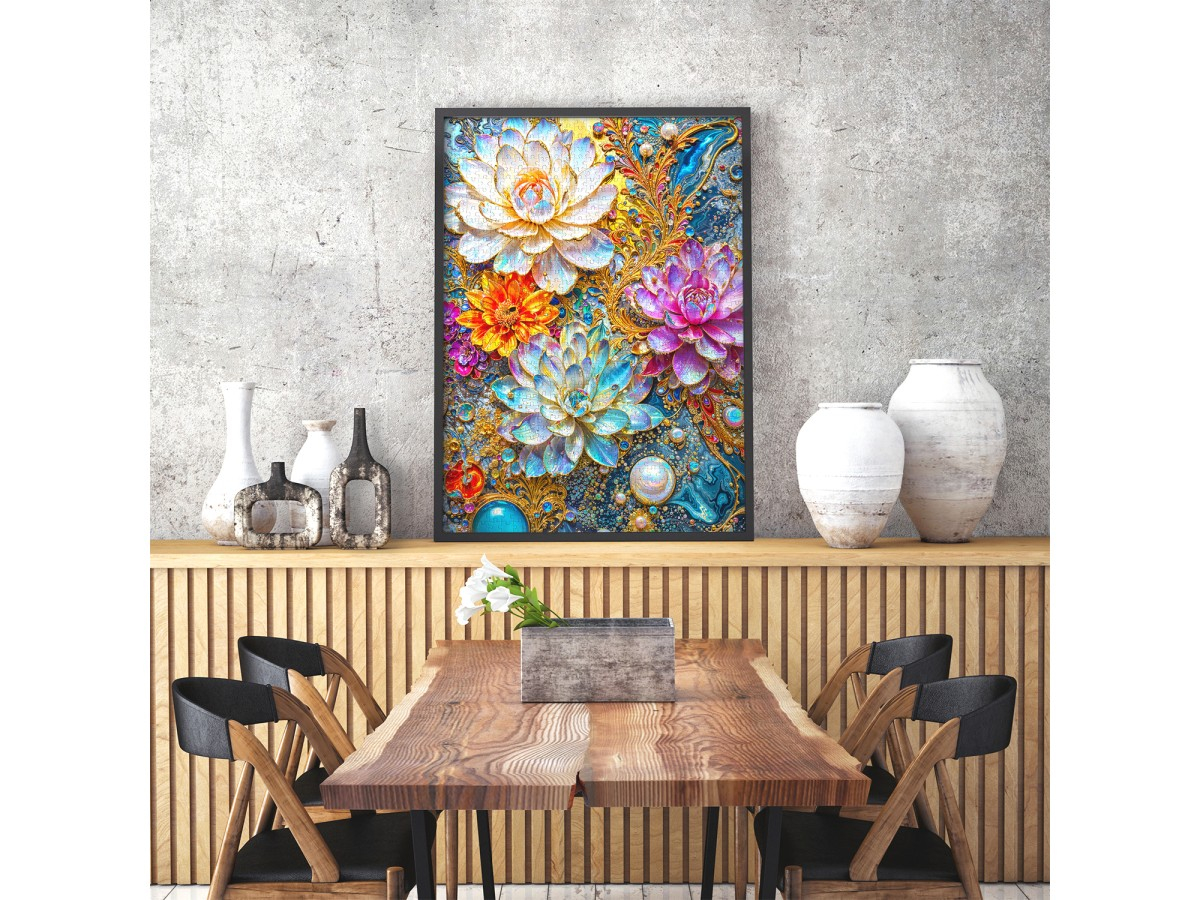 Admira eleganta si rafinamentul artei decorative cu puzzle-ul Enjoy – Pearlescent Waterlilies, o ilustratie digitala spectaculoasa ce imbina frumusetea naturii cu detaliile luxuriante ale designului ornamental. Nuferii stilizati, in nuante delicate de alb, roz si albastru, par sa pluteasca pe o apa perlata, inconjurati de reflexii si ornamente inspirate din bijuterii. Texturile fine, accentele stralucitoare si jocul subtil de lumina si culoare transforma aceasta imagine intr-o opera de arta plina de gratie si profunzime vizuala.