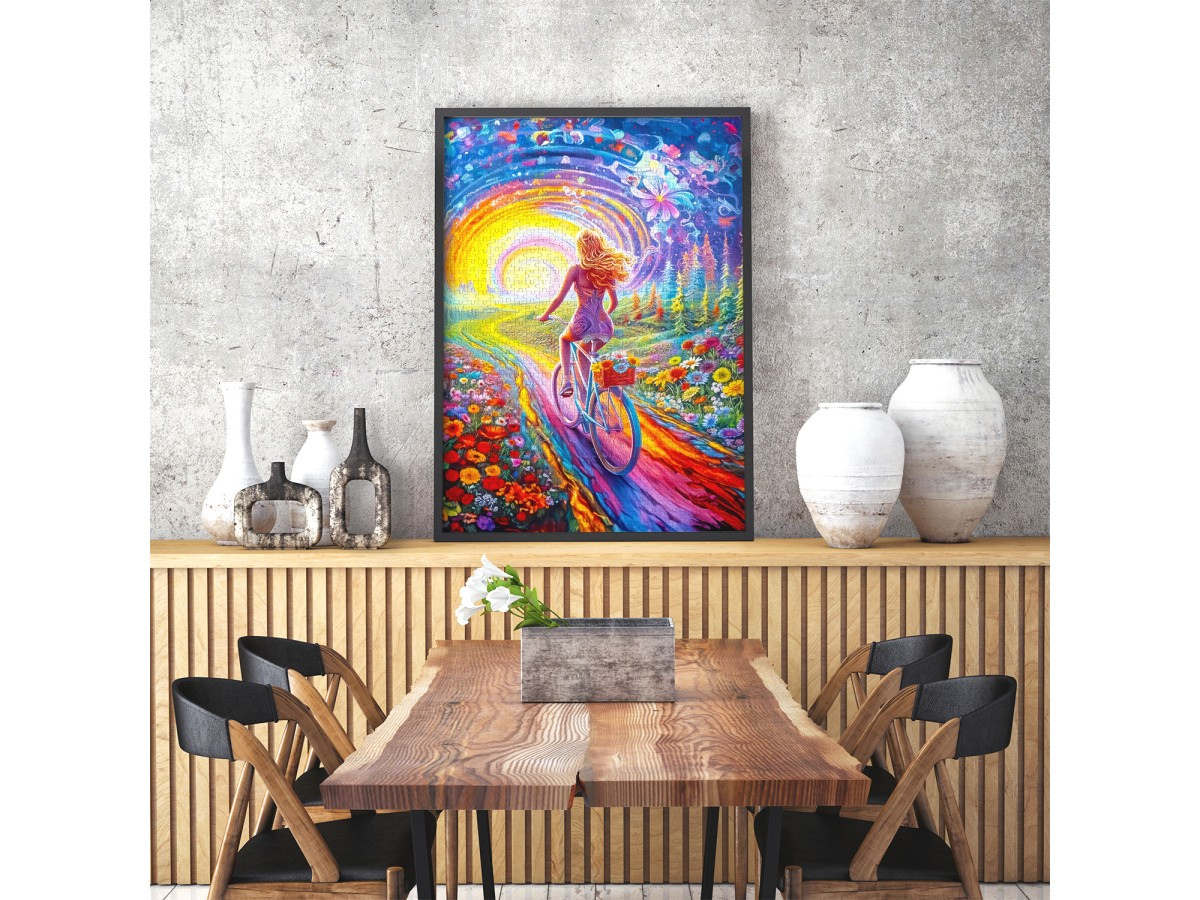 Porneste intr-o calatorie plina de culoare si libertate cu Puzzle 1000 piese Enjoy – Pedals to Freedom! Aceasta ilustratie vibranta surprinde o femeie pedalând pe o poteca colorata, spre un soare radiant care simbolizeaza optimismul si bucuria de a trai. Un puzzle artistic care inspira miscare, energie si armonie cu natura — perfect pentru momente de relaxare si creativitate.