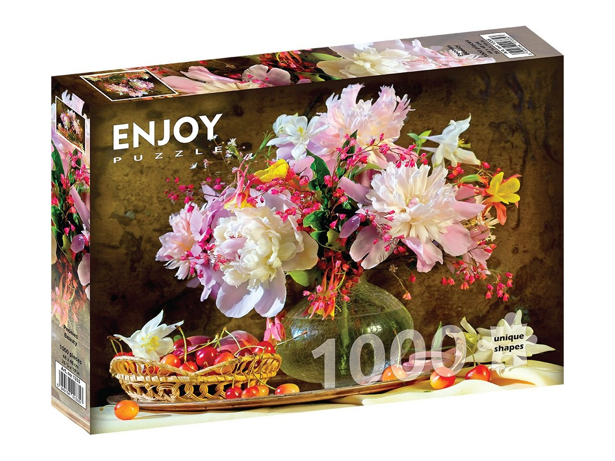 Puzzle 1000 piese Enjoy – Peonies Beauty. Aranjament floral elegant cu bujori, cirese si liliac, perfect pentru relaxare si rafinament 🧩🌸🍒