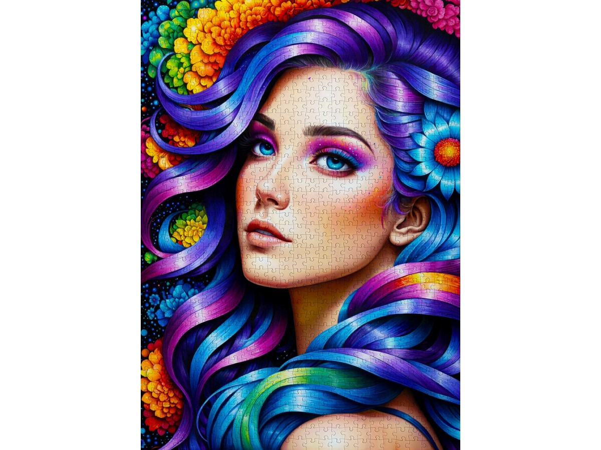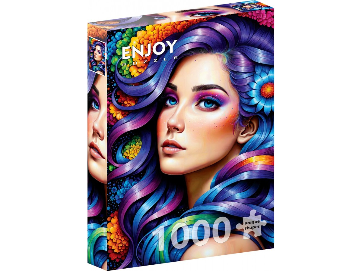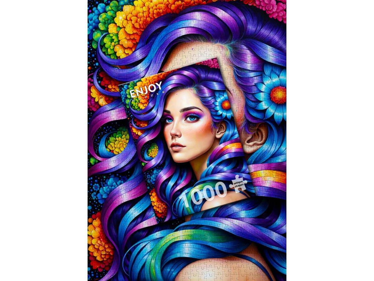 Lasa-te invaluit de magia culorilor cu Puzzle 1000 piese Enjoy – Rainbow Flower Portrait, o ilustratie digitala spectaculoasa ce surprinde portretul stilizat al unei femei cu parul lung si fluid, pictat in nuante vibrante de albastru, mov si turcoaz. Privirea sa expresiva, accentuata de machiajul intens in tonuri reci, se imbina perfect cu fundalul floral luxuriant in culori calde de portocaliu, galben si verde, creand un contrast vizual uimitor. Fiecare detaliu emana energie si rafinament, transformand acest puzzle intr-o adevarata explozie de culoare si emotie.