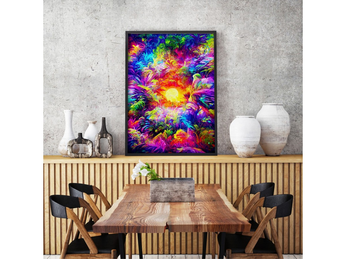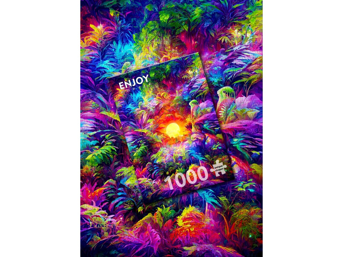 Patrunde intr-o lume plina de culoare si exotism cu puzzle-ul ENJOY – Rainbow Tropic, o ilustratie digitala vibranta care surprinde frumusetea luxurianta a junglei tropicale. Sub lumina intensa a soarelui, vegetatia densa si diversificata prinde viata printr-o explozie de nuante – verde, albastru, roz, purpuriu si galben – creand o scena plina de energie si mister.