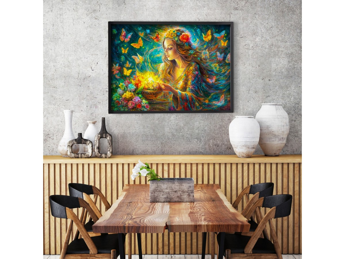 Lasa-te purtat intr-o lume magica, plina de culoare si simbolism, cu puzzle-ul ENJOY – Reborn, o ilustratie vibranta ce emana energie si renastere. Femeia din imagine, invaluita intr-o rochie colorata si tinand un vas stralucitor din care izvoraste lumina, este inconjurata de fluturi multicolori si elemente naturale ce transmit vitalitate si speranta.