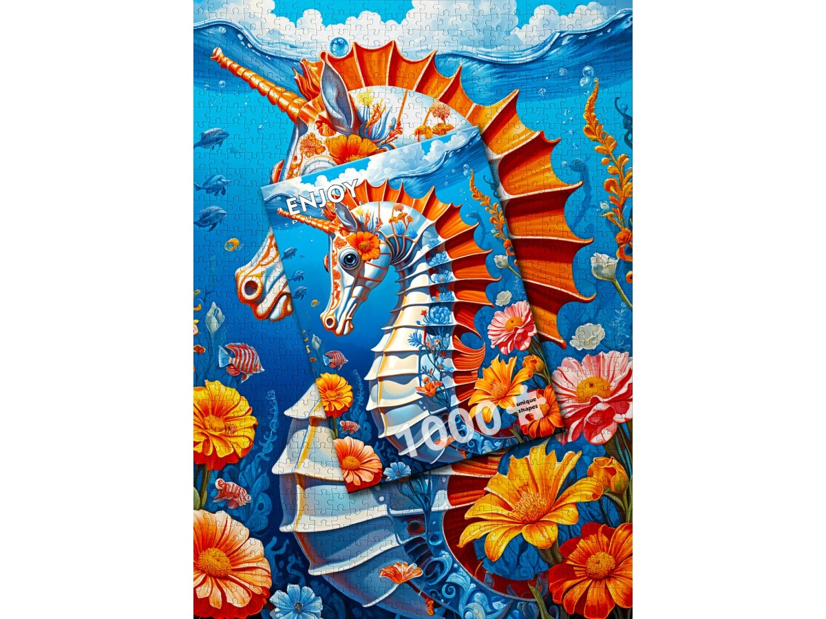 Exploreaza adancurile marii cu puzzle-ul Enjoy – Sea Horse, o ilustratie digitala spectaculoasa care imbina frumusetea naturii marine cu arta moderna. Imaginea surprinde un cal de mare stilizat, redat cu un nivel uimitor de detalii, inconjurat de flori colorate de hibiscus si plante acvatice care danseaza in tonuri vibrante de portocaliu, galben si albastru. Contrastul dintre nuantele calde si fundalul marin creeaza o compozitie vie si fascinanta.