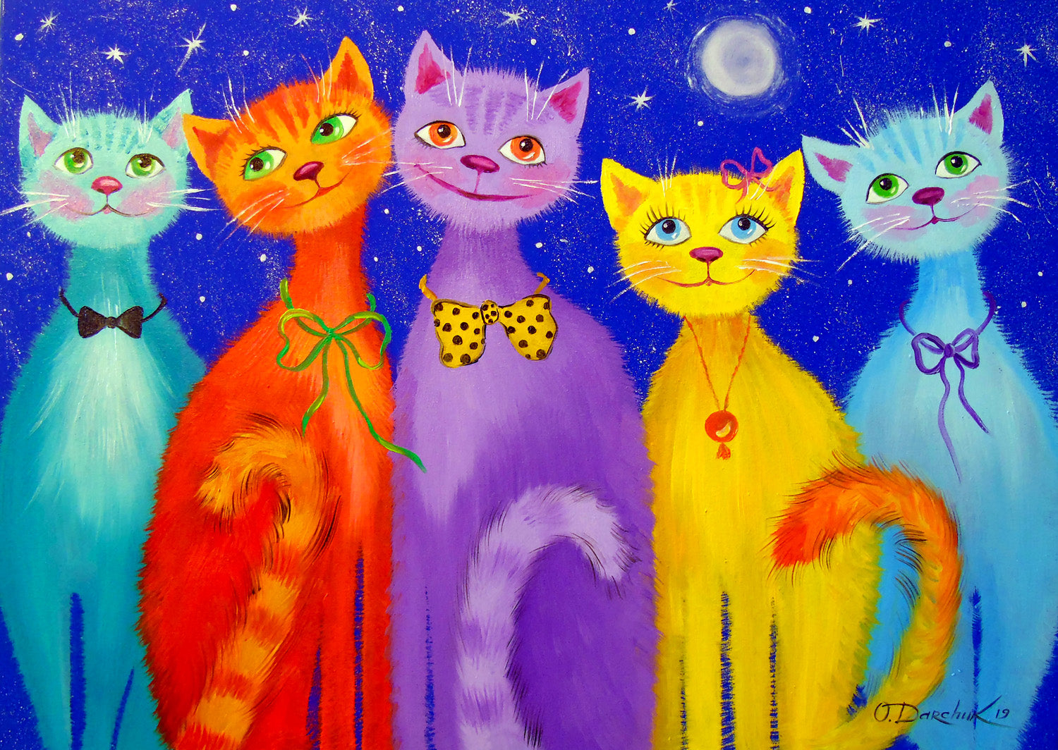 Fiecare pisică pare să aibă propria personalitate – unele poartă ochelari sau pălării, altele privesc curioase sau se joacă între ele. Această ilustrație digitală combină umorul cu estetica artistică, rezultând un puzzle plin de viață și culoare, care aduce instantaneu zâmbete și energie pozitivă.