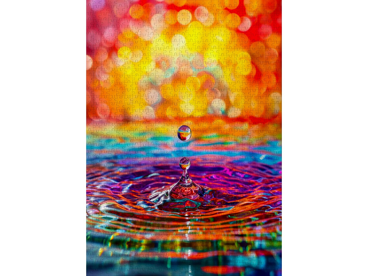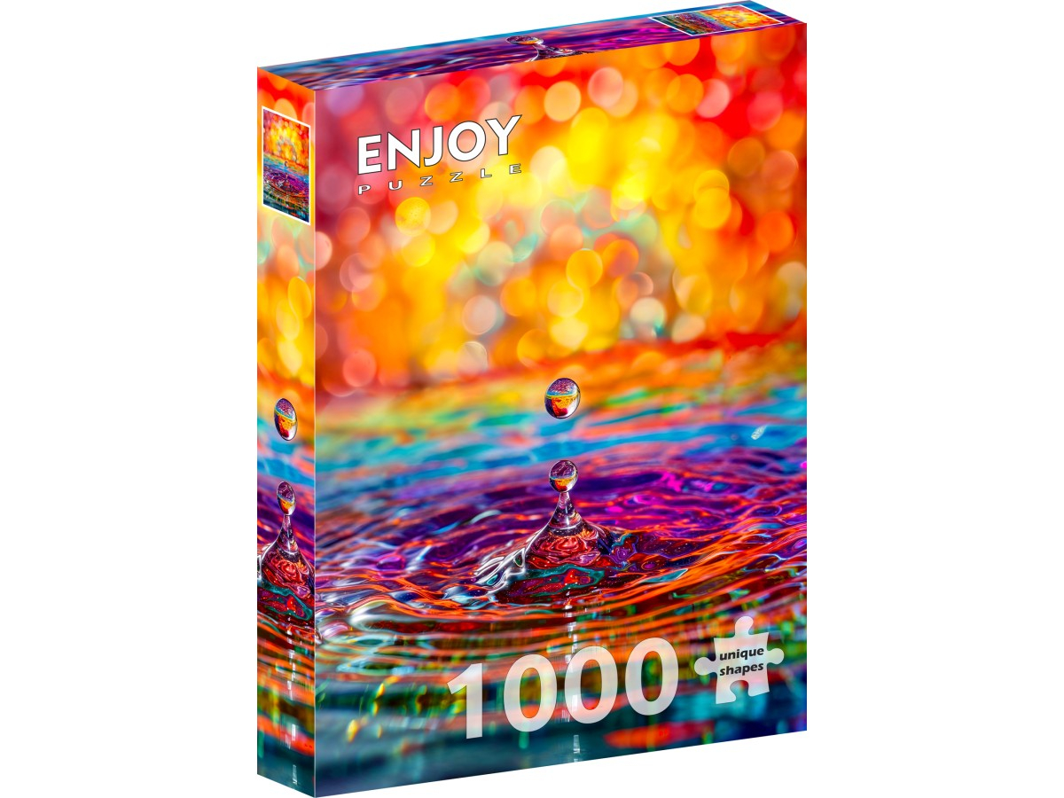Puzzle-ul Enjoy – Splash of Life surprinde un moment spectaculos, incarcat de energie si culoare, printr-o ilustratie digitala artistica ce reda impactul unei picaturi de apa. In centrul compozitiei, picatura aflata in suspensie si unda creata la suprafata apei simbolizeaza miscarea, vitalitatea si conexiunea dintre elemente. Fundalul vibrant, realizat din cercuri luminoase si tonuri calde de galben, portocaliu si rosu, creeaza un efect bokeh dinamic, care contrasteaza armonios cu nuantele intense de albastru, violet si turcoaz ale apei.
