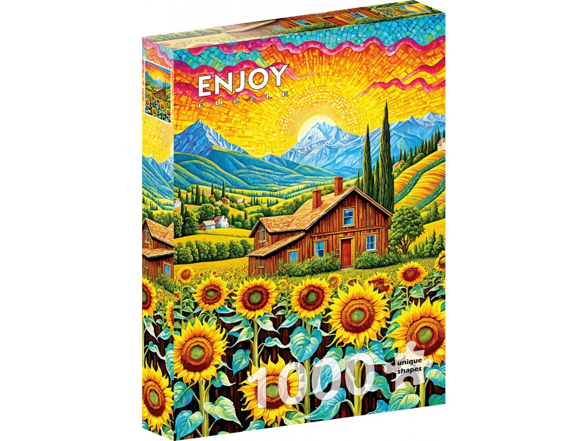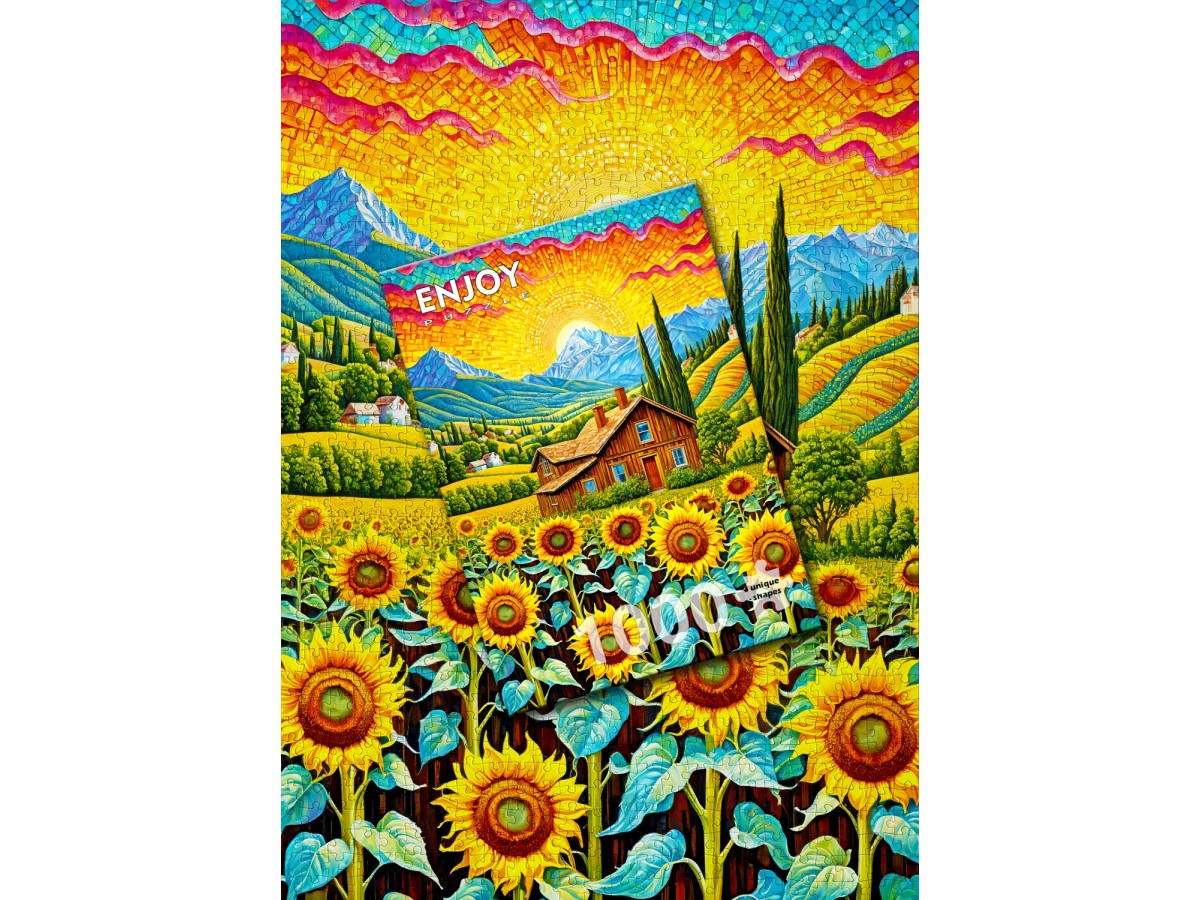 Puzzle-ul Enjoy – Sunflower House prezinta o ilustratie digitala expresionista, vibranta si plina de energie, ce surprinde o casa rustica din lemn inconjurata de un camp vast de floarea-soarelui. Cerul este pictat in tonuri intense de rosu, portocaliu si galben, sugerand un apus dramatic sau o atmosfera dinamica. Casa cu acoperis din sindrila si ferestre mici ocupa centrul compozitiei, iar detaliile bogate ale florilor soarelui adauga vitalitate si culoare peisajului rural.