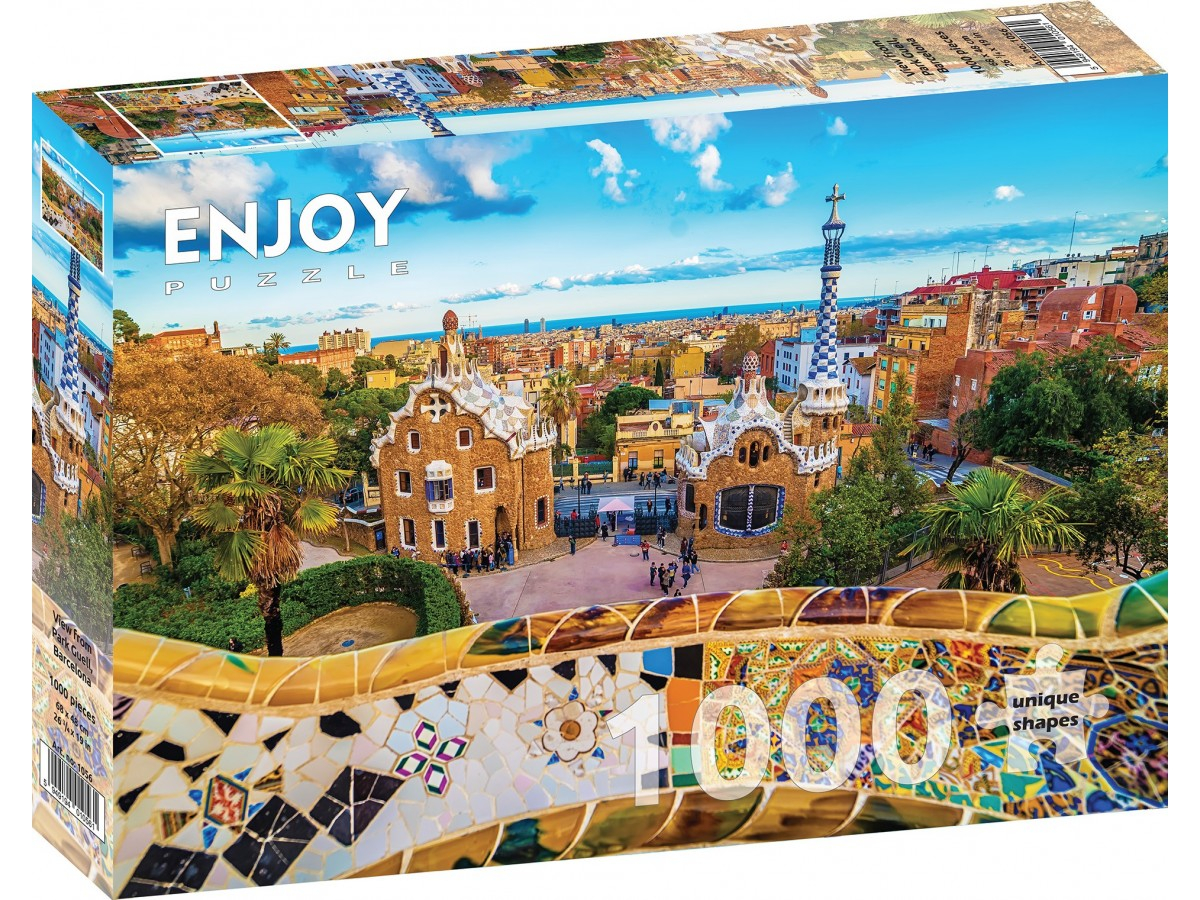 Puzzle-ul View from Park Güell, Barcelona – 1000 piese de la Enjoy te poartă direct în inima Spaniei, în lumea plină de culoare și imaginație a celebrului arhitect Antoni Gaudí. Fotografia vibrantă surprinde panorama spectaculoasă a Parcului Güell, cu banca ondulată decorată în mozaicuri multicolore și clădirile fantastice care par desprinse dintr-un basm modernist. Fundalul oferă o priveliște de vis asupra Barcelonei, sub un cer luminos în nuanțe de albastru și portocaliu, ce amplifică energia artistică a scenei.