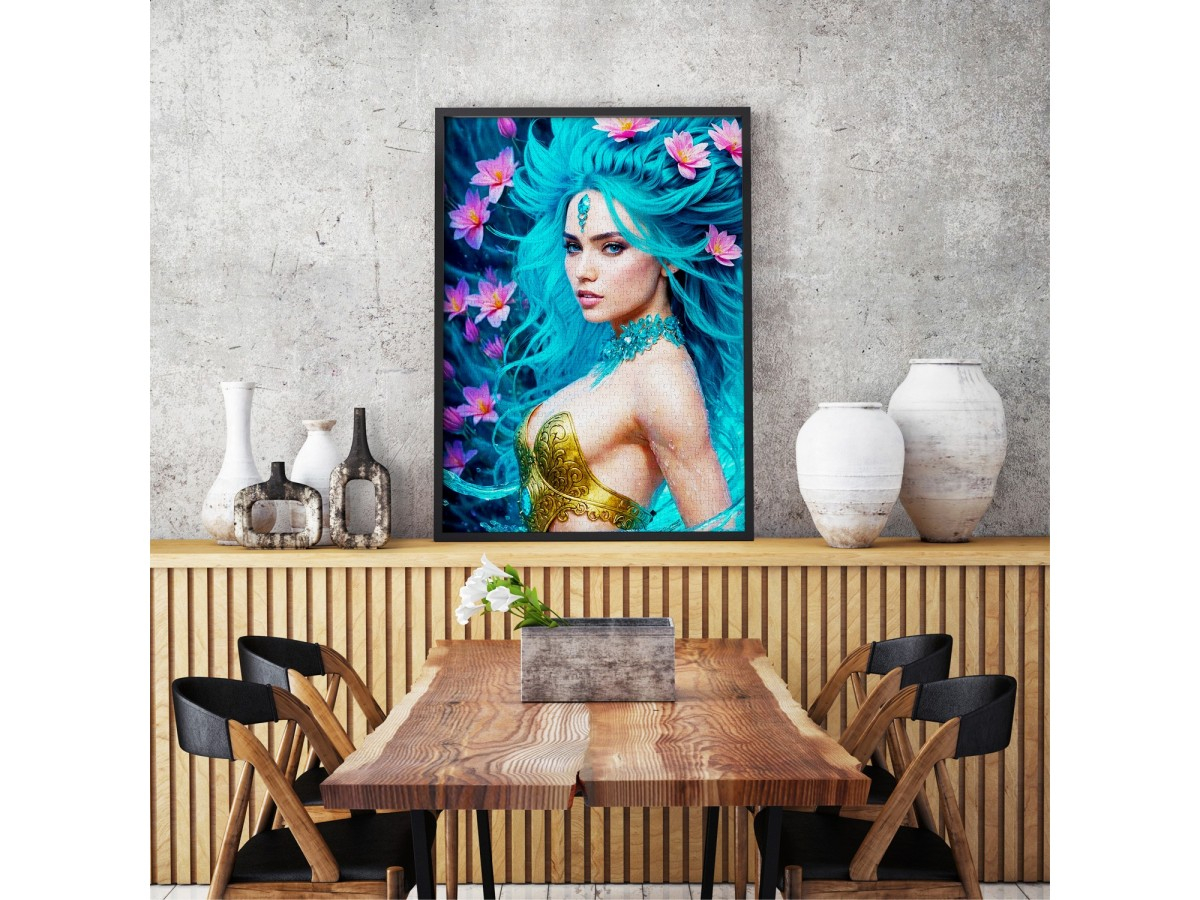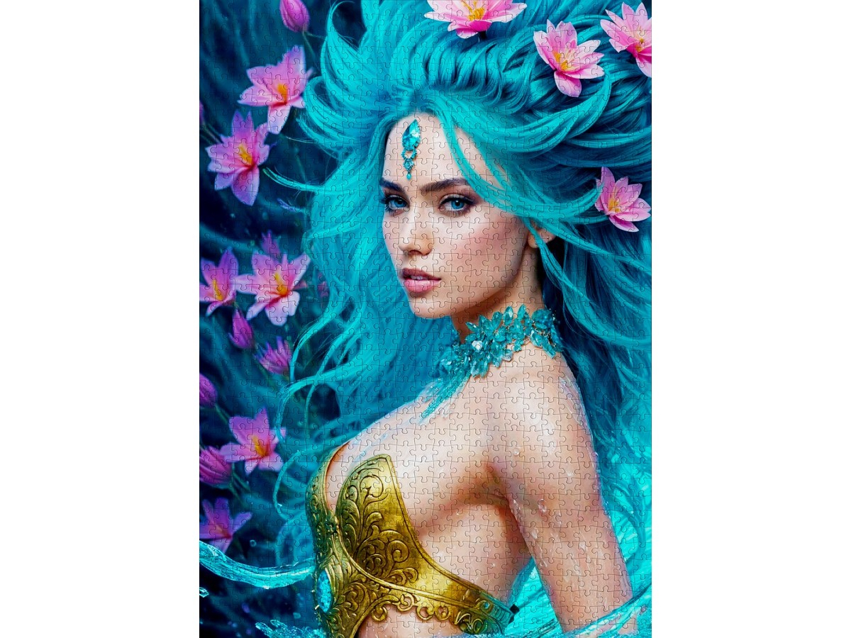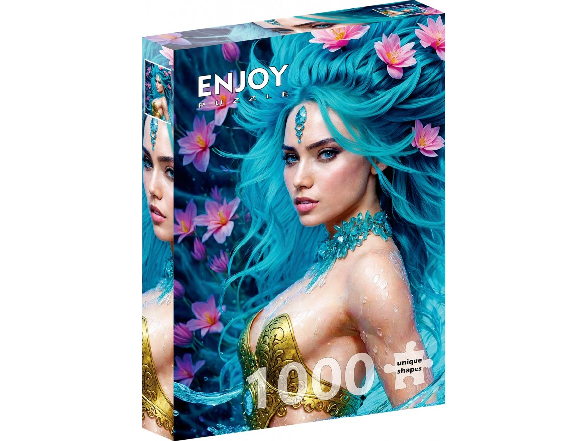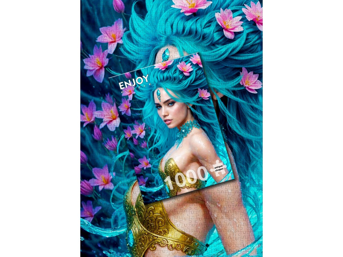 Lasa-te purtat de valurile armoniei si ale frumusetii naturale cu Puzzle 1000 piese Enjoy – Water Element, o ilustratie digitala spectaculoasa ce surprinde portretul unei femei misterioase inspirate de elementul apa. Parul sau lung, in nuante de albastru-turcoaz, este impodobit cu flori delicate de lotus roz, iar bijuteria de pe frunte si ornamentele din corali ii completeaza eleganta si rafinamentul. Privirea ei patrunzatoare emana calm si intelepciune, evocand forta si echilibrul naturii.