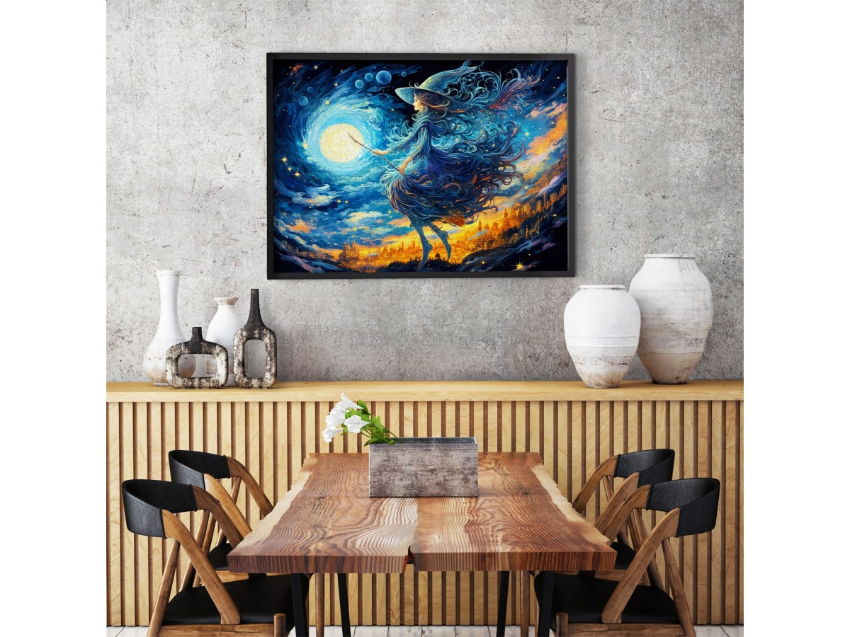 Patrunde intr-o lume magica si misterioasa cu puzzle-ul ENJOY – Witch’s Night Out, o ilustratie digitala plina de culoare, farmec si energie. In centrul scenei se afla o tanara vrajitoare cu parul lung si ondulat, imbracata intr-o rochie eleganta, tinand in mana un glob luminos ce pare sa influenteze cerul instelat de deasupra orasului. Atmosfera nocturna, dominata de nuante de albastru inchis si violet, este presarata cu stele stralucitoare si accente luminoase care dau viata compozitiei.