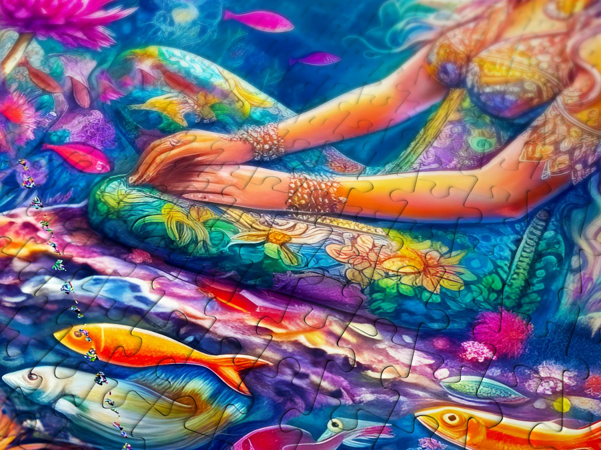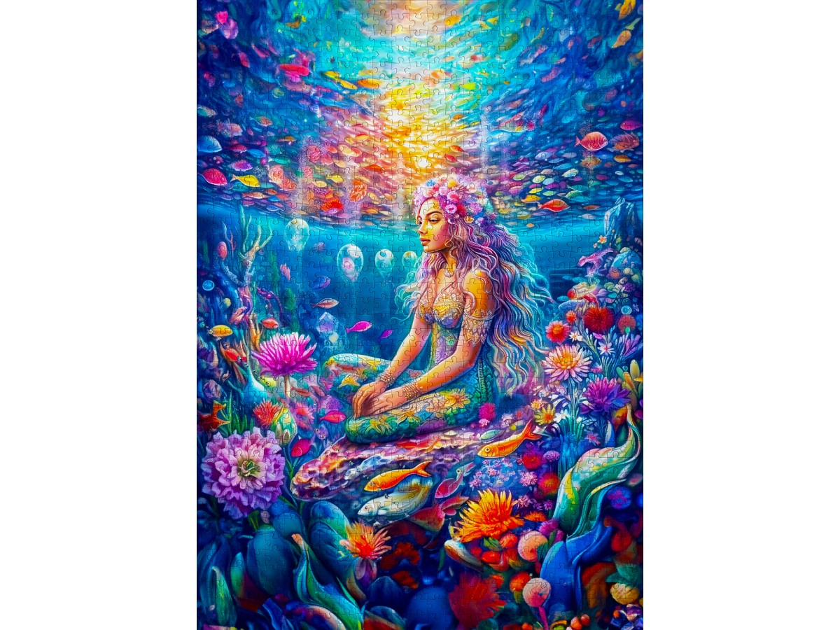Cufunda-te intr-o lume magica subacvatica cu Puzzle 1000 piese Enjoy – Within the Depths, o ilustratie plina de culoare, mister si frumusete. Imaginea fascinanta prezinta o sirena in mijlocul oceanului, inconjurata de corali, pesti exotici si lumini care danseaza prin apa. Un puzzle ce imbina perfect relaxarea, arta si imaginatia, oferind o experienta vizuala de neuitat.