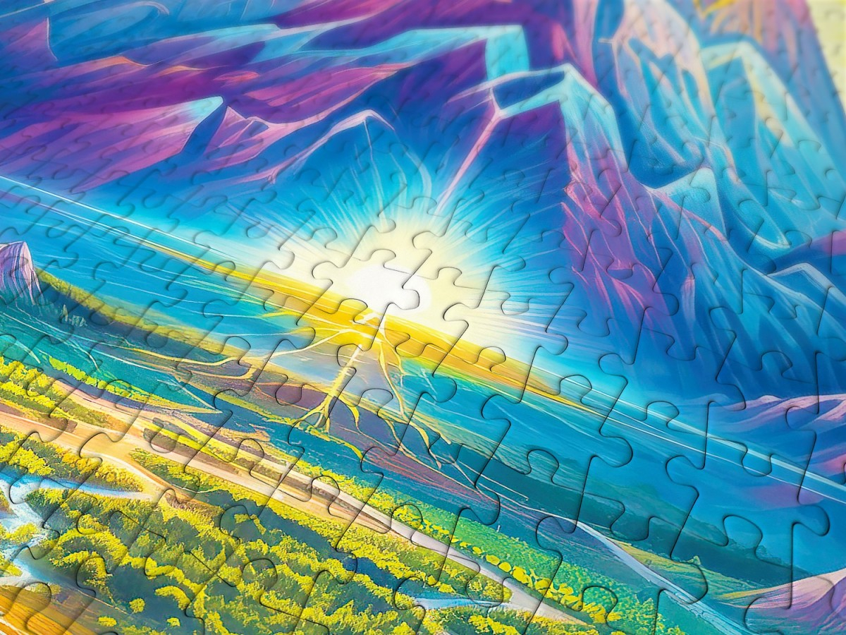 Descopera magia naturii si misterul muntelui luminos cu puzzle-ul Enjoy – Woodland Pyramids, o ilustratie digitala spectaculoasa ce reda un peisaj mistic plin de culoare si armonie. In centrul compozitiei, un munte in forma de piramida se inalta impunator, luminat de o raza divina ce strapunge cerul plin de nori roz, mov si portocalii. Apele limpezi care se revarsa din varf serpuieste printre paduri dese si vai verzi, creand o scena de basm. Atmosfera mistica si detaliile fine transforma fiecare piesa intr-o experienta vizuala de neuitat.