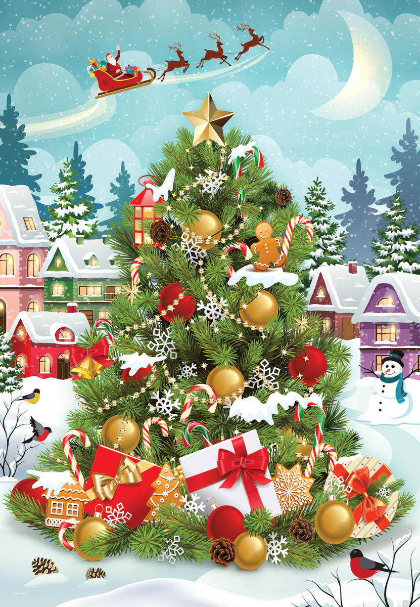 Christmas Tree Tin – Puzzle 550 piese aduce toată magia Crăciunului într-un format unic și festiv. Imaginea ilustrată prezintă un brad decorat cu ornamente strălucitoare, acadele, steluțe aurii și cadouri împachetate, evocând atmosfera caldă și plină de bucurie a sărbătorilor de iarnă.