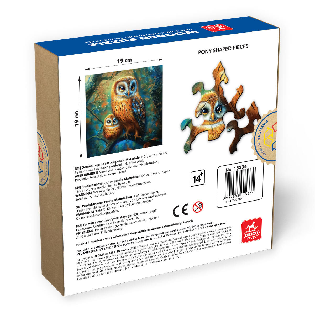 Infrunta o provocare deosebita cu Puzzle Lemn Bufnita – o ilustratie misterioasa, plina de farmec, ce surprinde o bufnita in decor nocturn. Fiecare piesa are o form unica, oferindu-ti o experienta diferita fata de puzzle-urile clasice si un nivel ridicat de dificultate. Realizat din HDF rezistent, acest puzzle este ideal pentru colectionari, iubitorii de natura si pasionatii de activitati relaxante. Recomandat pentru 14+ ani. Include posibilitate de ambalare cadou.