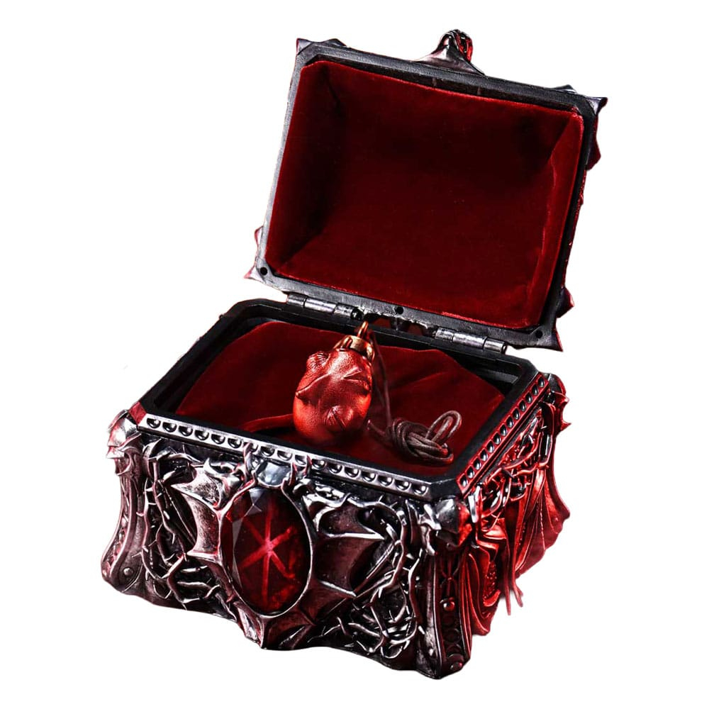 The skull-shaped box that houses this piece is an original Prime 1 Studio design, inspired by motifs closely associated with the Skull Knight-skulls, swords, and curling rose vines. Velvet-like fabric lines the interior, while an LED-lit Brand of Sacrifice offers a glimpse into the abyss.