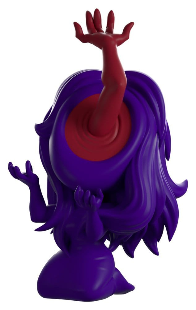 Youtooz has followed the trail of symbols into the attic to confront Amy Martin for her debut! Kneeling at 4.6 inches tall and throwing her hands forward in anguish as a demonic arm reaches towards the sky from the gaping hole where her face should be, long purple hair cascades from her head over her shoulders and arms as she wears a tight ankle-length dress. The exterior of her packaging sees a lone stone well in a dense forest, while the interior looks into an empty room with muted brown furniture. The protective sleeve is then covered in a pixelated pink and purple skyline of clouds and a setting sun, as her figure can be seen through the large, clear window at the packaging's front. This collectible ships in a matte, embossed, protective outer sleeve and a custom-sized plastic protector for maximum protection during shipping.