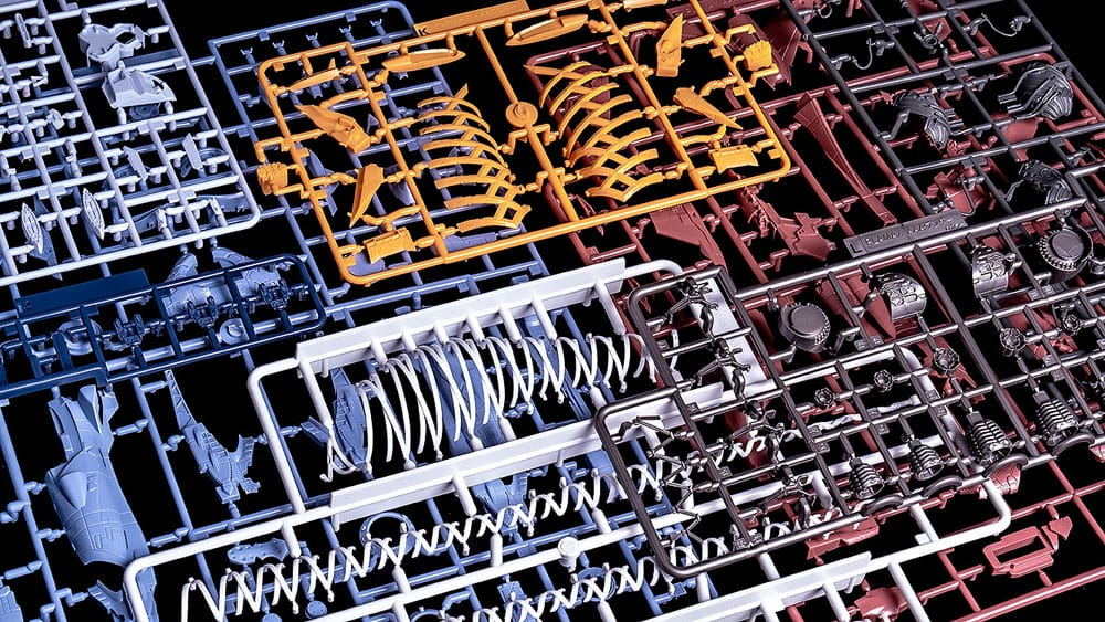 From "Rebuild of Evangelion" comes a plastic model of AAA Wunder, WILLE's main aerial battleship. The model kit is about an impressive 509mm in length and 406mm in width, and packed with details and intricate sculpting. The various parts of the mecha have been separated into nine different colored runners, making it easy to recreate the battleship with a simple assembly. The main armament and antennas are articulated. The rib-like white structures and complicated piping allow for a clear view of the main engine contained within. The dedicated display base allows the battleship to be displayed in either horizontal flight mode or advancing while breaking through the L-Barrier boundary with deep rolls. The main wings and left/right fuselage sections are designed to be removable even after assembly, allowing for easy display and transport.
