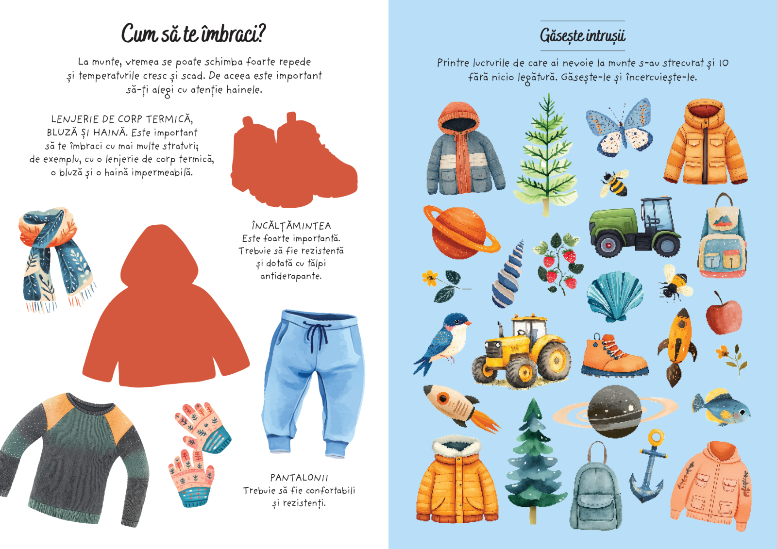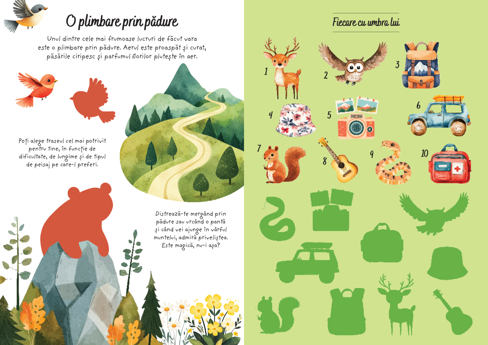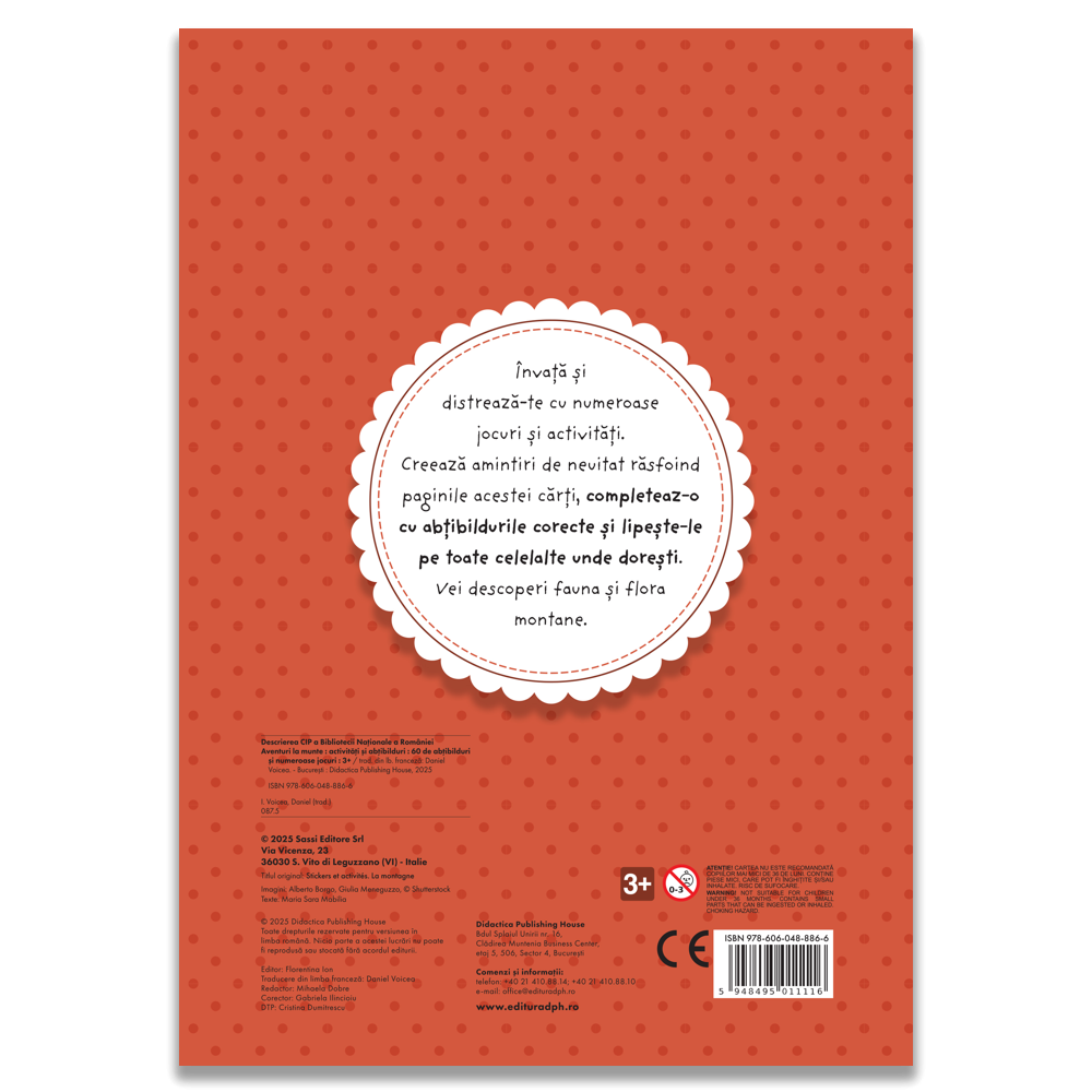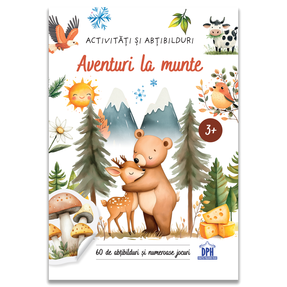 Copiii descopera animale, pasari, copaci, flori, trasee si refugii montane, rezolva labirinturi si jocuri de atentie si completeaza paginile cu ajutorul celor 60 de abtibilduri incluse. Activitatile sunt concepute pentru a dezvolta atentia, logica, creativitatea si vocabularul, oferind in acelasi timp o experienta relaxanta si plina de culoare. Cei mici pot crea propriile scenarii si isi pot personaliza paginile, stimulandu-si imaginatia si motricitatea fina.