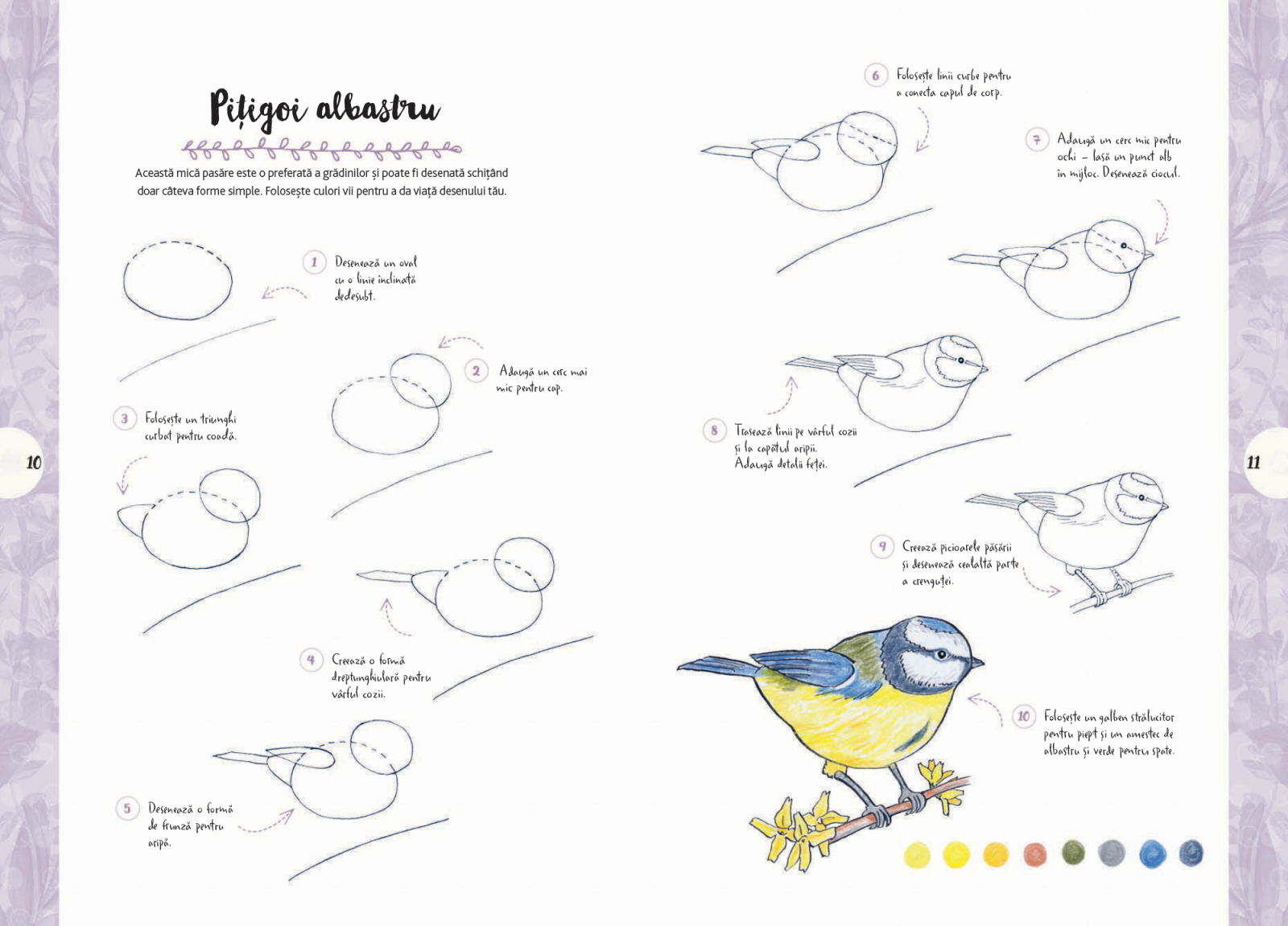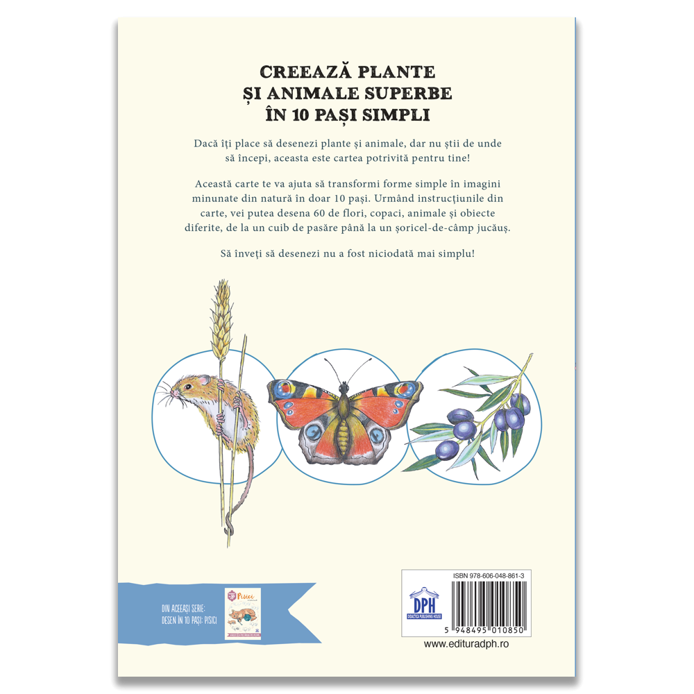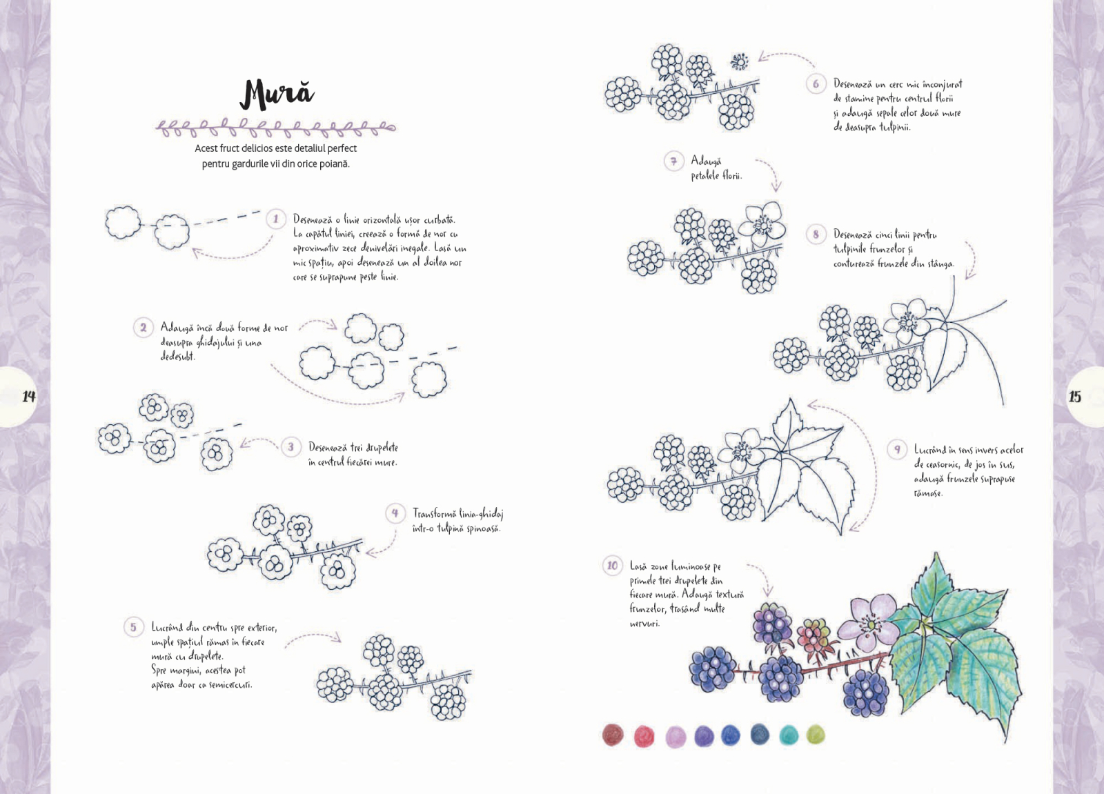 Volumul include peste 60 de modele inspirate din natura: flori, frunze, insecte, pasari, animale salbatice si elemente de peisaj. Fiecare desen este explicat pas cu pas, astfel incat procesul sa fie accesibil si celor aflati la inceput de drum. In plus, cartea ofera sfaturi practice pentru folosirea culorilor si adaugarea detaliilor realiste, ajutand la dezvoltarea increderii in propriile abilitati artistice.