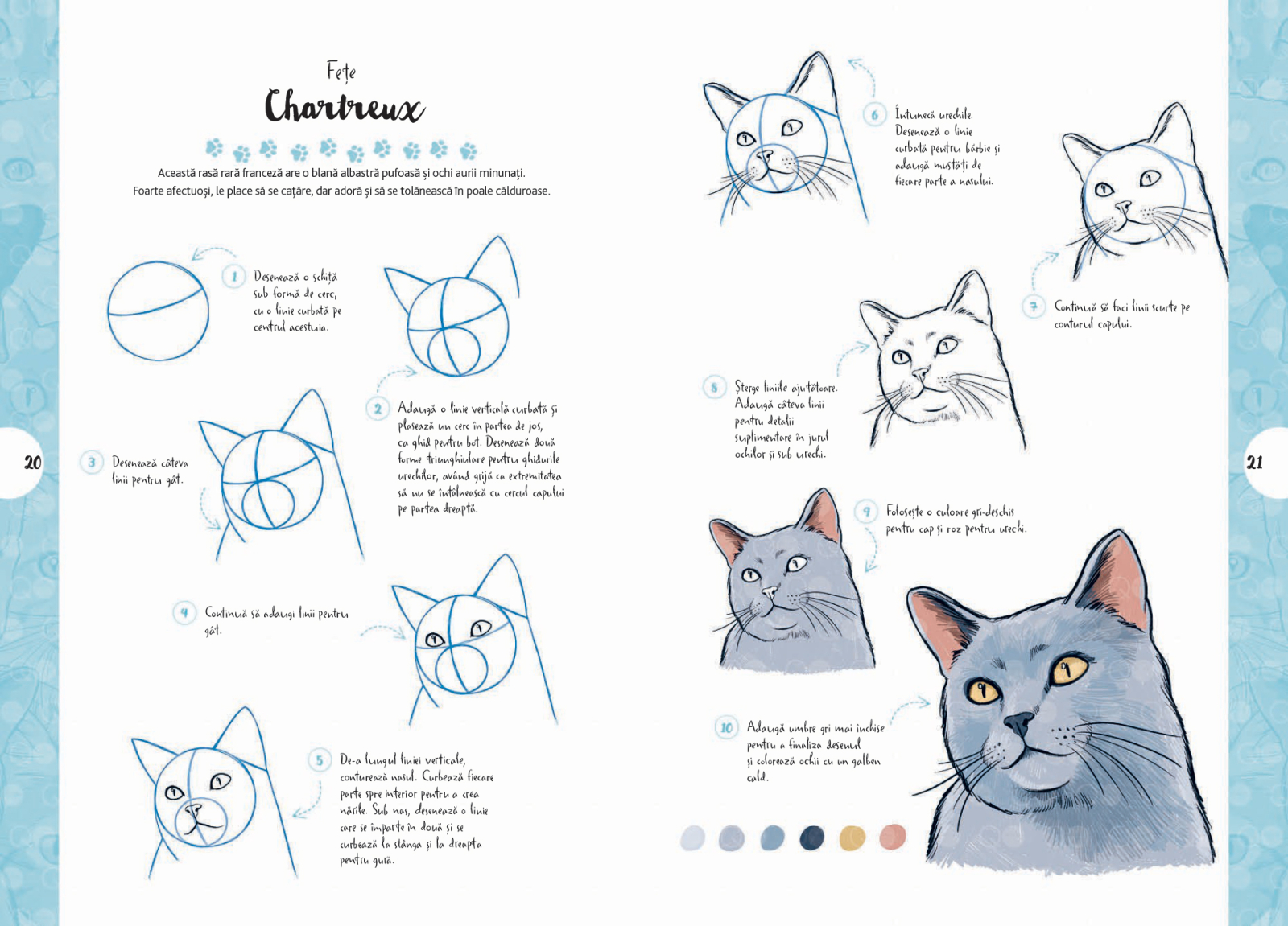 Volumul include 50 de portrete adorabile de pisici, de la pui jucausi si ghemotoace pufoase pana la pisici elegante si relaxate. Fiecare ilustratie porneste de la forme de baza usor de reprodus si evolueaza treptat catre un desen detaliat si expresiv. Tot ce este necesar este un creion, o foaie si dorinta de a exersa.