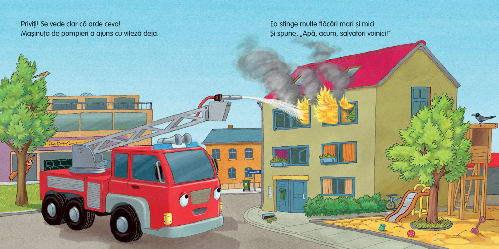 Noapte buna, masinuta de pompieri, scrisa de Natalie Mendes, este o poveste de seara plina de caldura si rime jucause, dedicata copiilor de peste 2 ani. Dupa o zi intensa de interventii si aventuri, micuta masinuta de pompieri, obosita dar fericita, se pregateste de culcare. Inainte sa adoarma, isi viziteaza prietenii – masina de politie, excavatorul si ambulanta – pentru a le ura tuturor noapte buna.