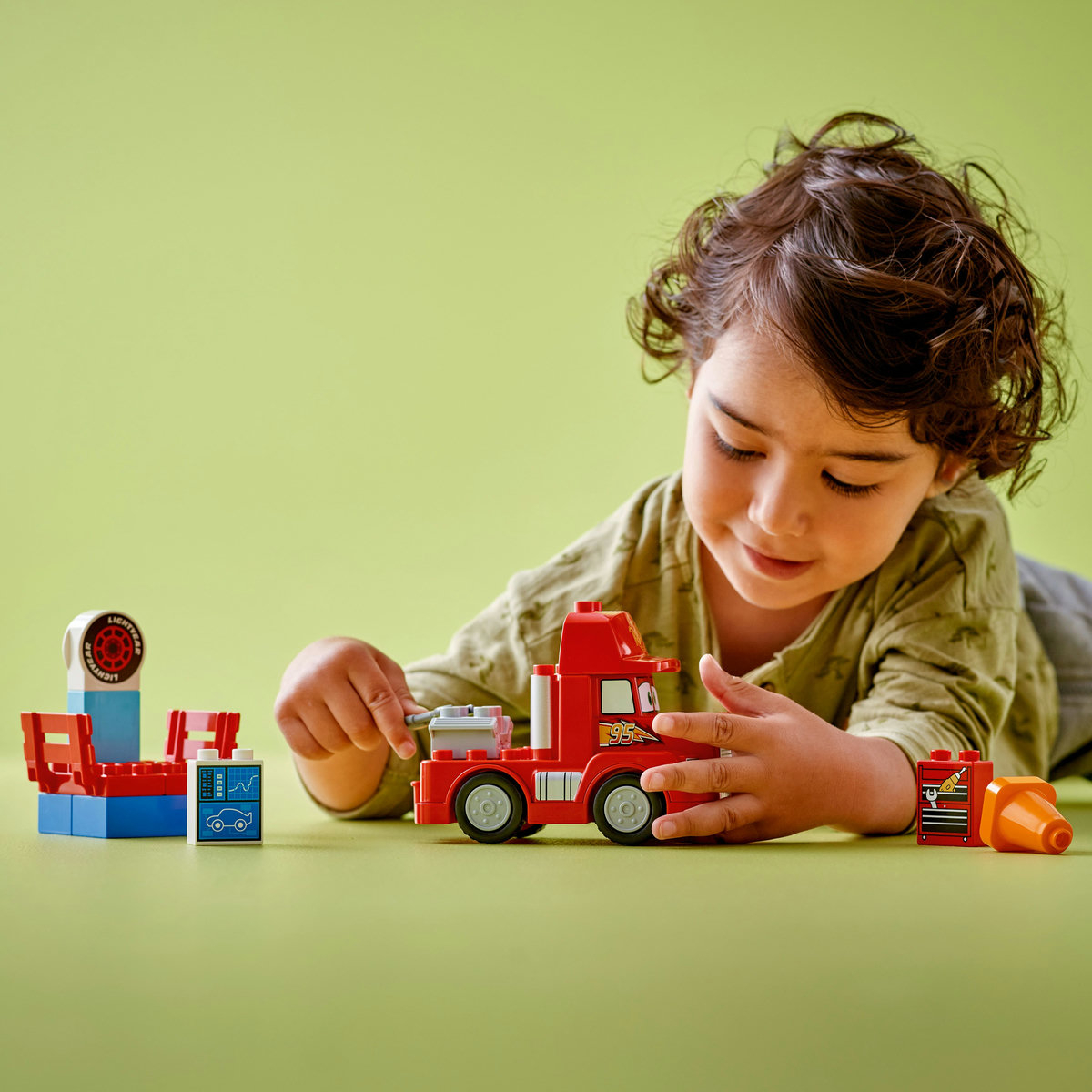 Cu personaje familiare, decoruri cool si dotari atractive, jucariile de constructie LEGO® DUPLO® +u00a6Masini de la Disney si Pixar inspira familiile sa interactioneze si sa creeze povesti amuzante cu personajul Mack din cunoscutele filme, împartasind totodata momente pretioase din dezvoltarea micilor mecanici de curse.