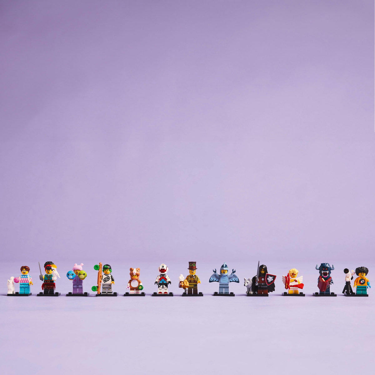 Fiecare cutie conţine 1 minifigurină LEGO surpriză, în total fiind 12 personaje de colecţionat: Stăpânul lupilor, Pirat comandant secund, Inventator Steampunk, Fan în costum de pterodactil, Baubau, Pilot de curse cu rucsac cu propulsie, Iubitor de pisici, Practicant de longboarding, Puşti astronom, Cupidon, Fan în costum de hamster şi Colecţionar de jucării de pluş.
